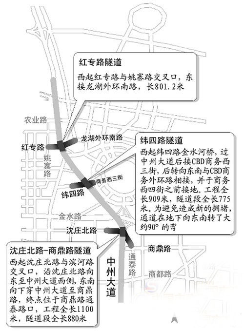2014年11月30日,鄭州緯四路下穿中州大道工程已實(shí)行單幅西向東試通車(chē),而紅專(zhuān)路下穿中州大道也于次日雙向機(jī)動(dòng)車(chē)道放行。預(yù)計(jì)春節(jié)前,兩個(gè)下穿通道人行道和非機(jī)動(dòng)車(chē)道也將通行,鄭州金水路、中州大道和未來(lái)路等周邊道路的交通壓力將得到極大緩解。